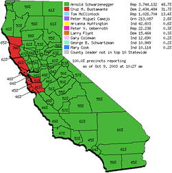 All numbers referencing ballot returns were taken from the California Statewide Special Election Results web site, as provided by the California Secretary of State, on October 8, 2003. Those numbers may change from day to day, and final certified election results may differ. Due to rounding, reduced size, and shared borders, pixel counts for some counties are approximate. Gray border lines on the drawn maps are for separation only, and are not included as part of the county’s area.