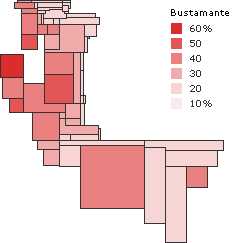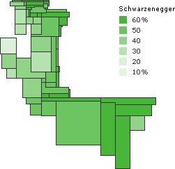 Measuring the map pixel by pixel, Arnold Schwarzenegger is clearly the leading candidate across almost all of California’s land mass, while Cruz Bustamante trails far behind. Now, how closely does this relative measure of surface area match the actual votes cast for each candidate?