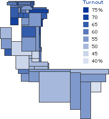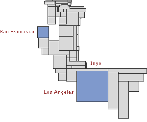 Note that the relative size of each county has shifted dramatically. Densely populated counties like San Francisco (239,789 votes cast) and Los Angeles (1,964,853 votes cast) have jumped in size, while less populated counties like Inyo (5,459 votes cast) have shrunk to a fraction of their physical area.
