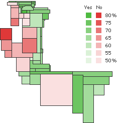 The new map provides a slightly more balanced relative surface area, but it fails to account for the percentage of the vote won by each candidate. The official map writes the actual percentage value within the border of each county, using numbered arrows for the smaller counties.