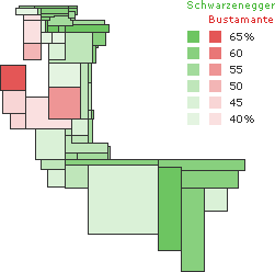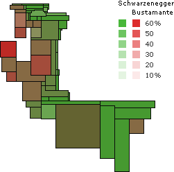 Of that total, 81,560 pixels (95%) are Schwarzenegger green, and 4,471 pixels (5%) are Bustamante red.