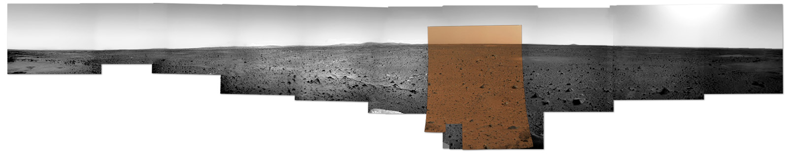 On January 6, NASA released Spirit’s first color photograph, shown here overlaid on the retouched panorama: