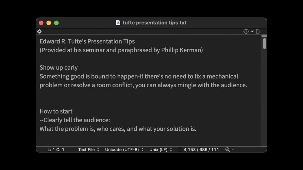 So going into my first professional talk, all I really had was a text file of advice from Edward Tufte that had been paraphrased by someone who went to one of his talks.