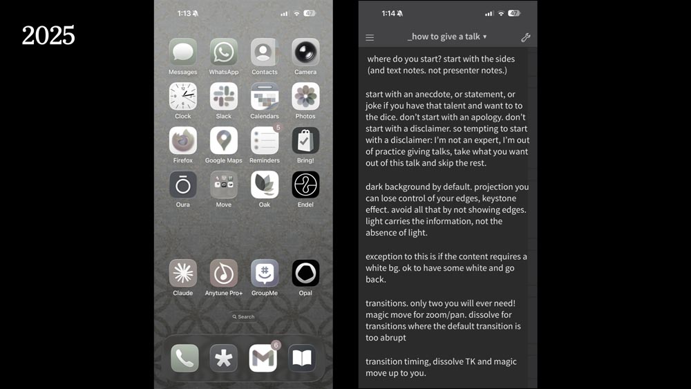 So even though it’s a linear progression and it’s progressing in time, I still try to think about: What can I set up at one point in the talk that has a payoff later?