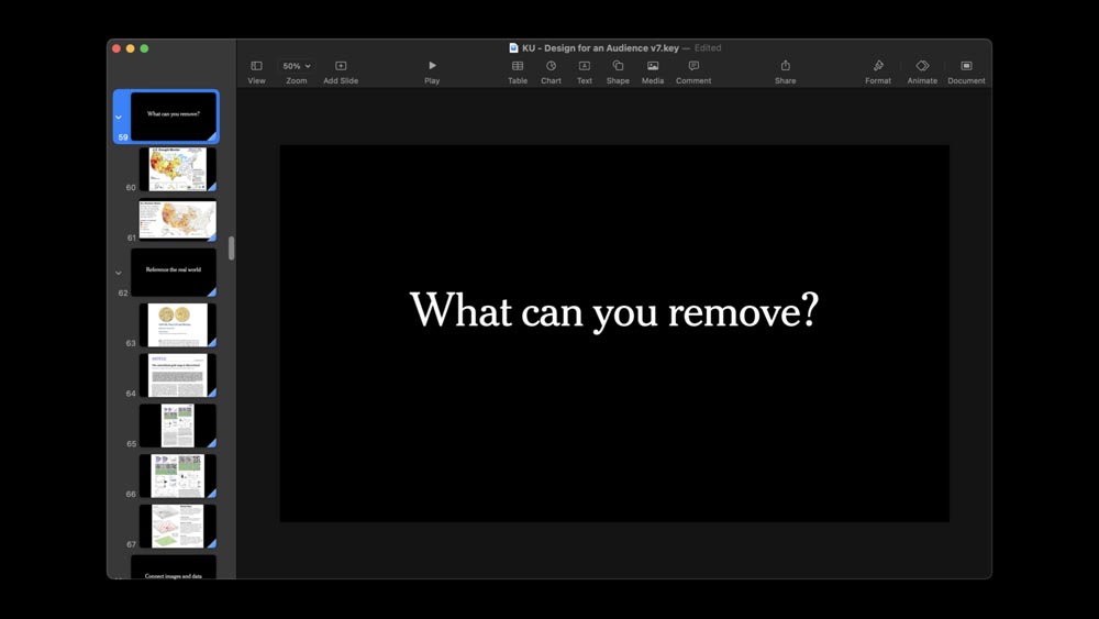 I’ll break it into four sections, and then as I work my way through, it becomes almost like a progress bar, so the audience can follow it, can see where I’m going, where we’ve been. It sort of becomes a glue that holds the talk together.