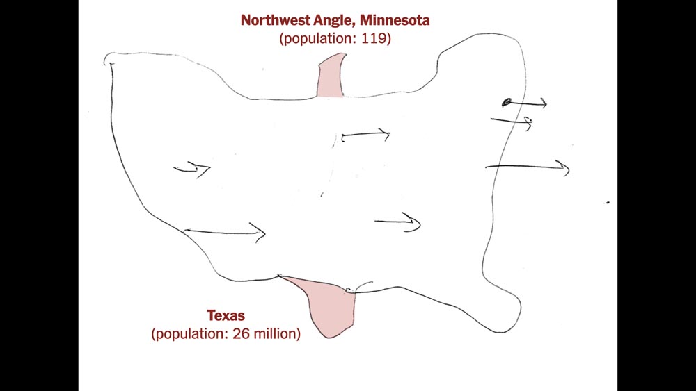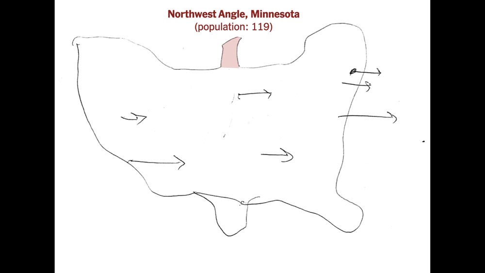 So when he drew this map of the United States, he’s adding in the Northwest Angle here. It’s that tiny little piece of Minnesota that sticks up into Canada, with a population of 119.