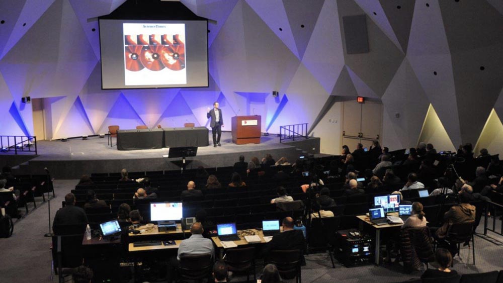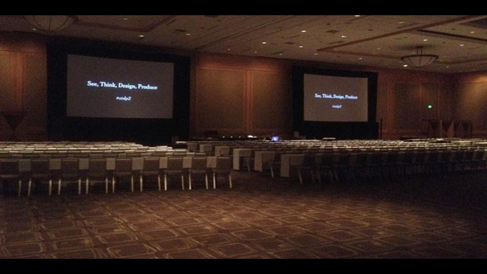 So Tufte’s room setup is designed with that in mind. He has two screens. The audience is set up to be quite wide instead of deep. And there’s a nice runway so you can walk back and forth.