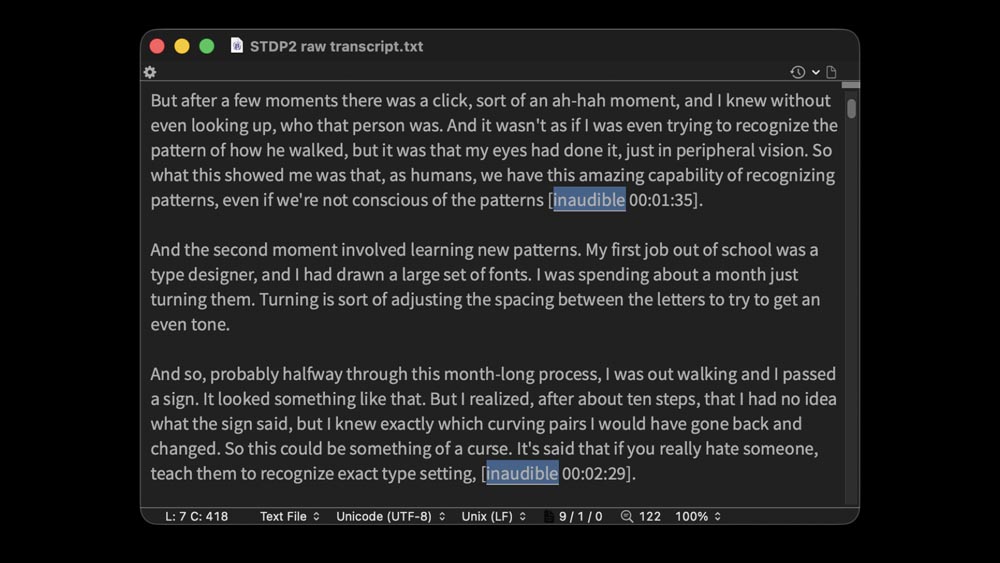 So this was the transcript for the second “See, Think, Design, Produce.” And I noticed going through it — this was before Trint, so I paid someone online to make the transcription — that there were a number of inaudibles. I was wearing a mic, so there shouldn't have been inaudibles, and it looked like they tended to be at the end of sentences. So I was wondering: What’s going on?